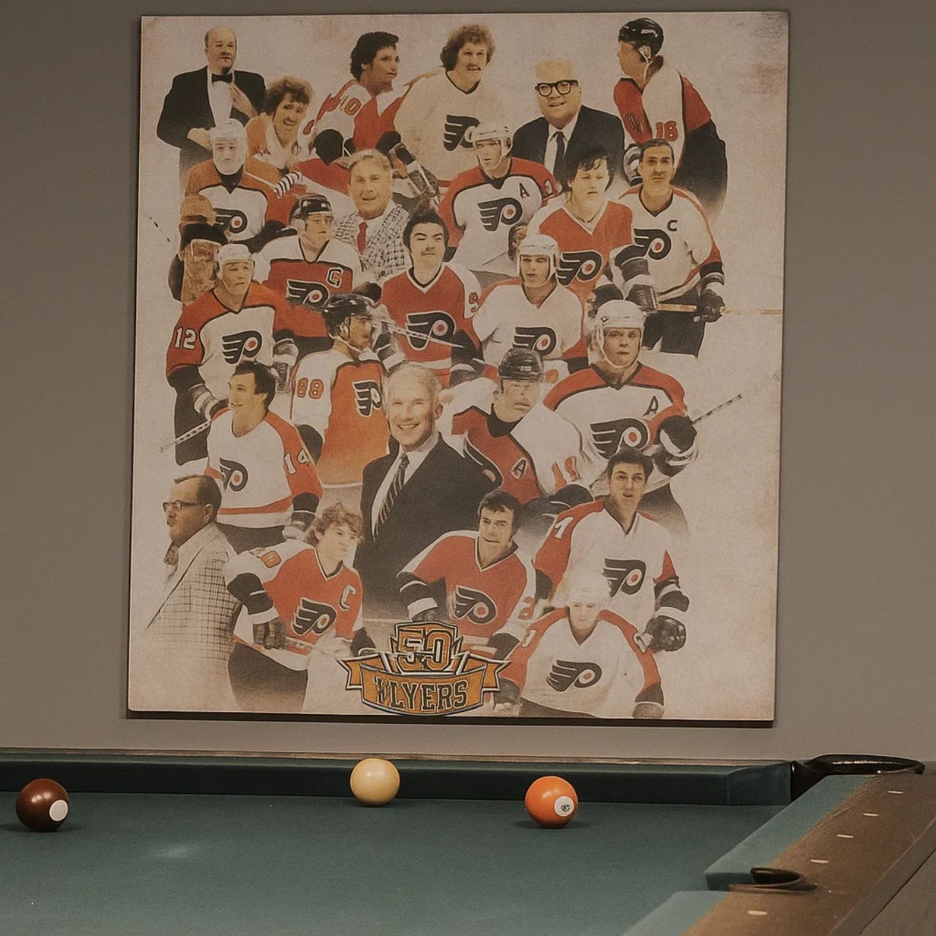 This poster is a tribute to the rich history of the Philadelphia Flyers and an essential addition to any NHL memorabilia collection. Limited in quantity, it captures legendary moments and iconic players from the team’s 50th anniversary season. Display it proudly as a centerpiece in your home, office, or sports room to honor Flyers hockey history.