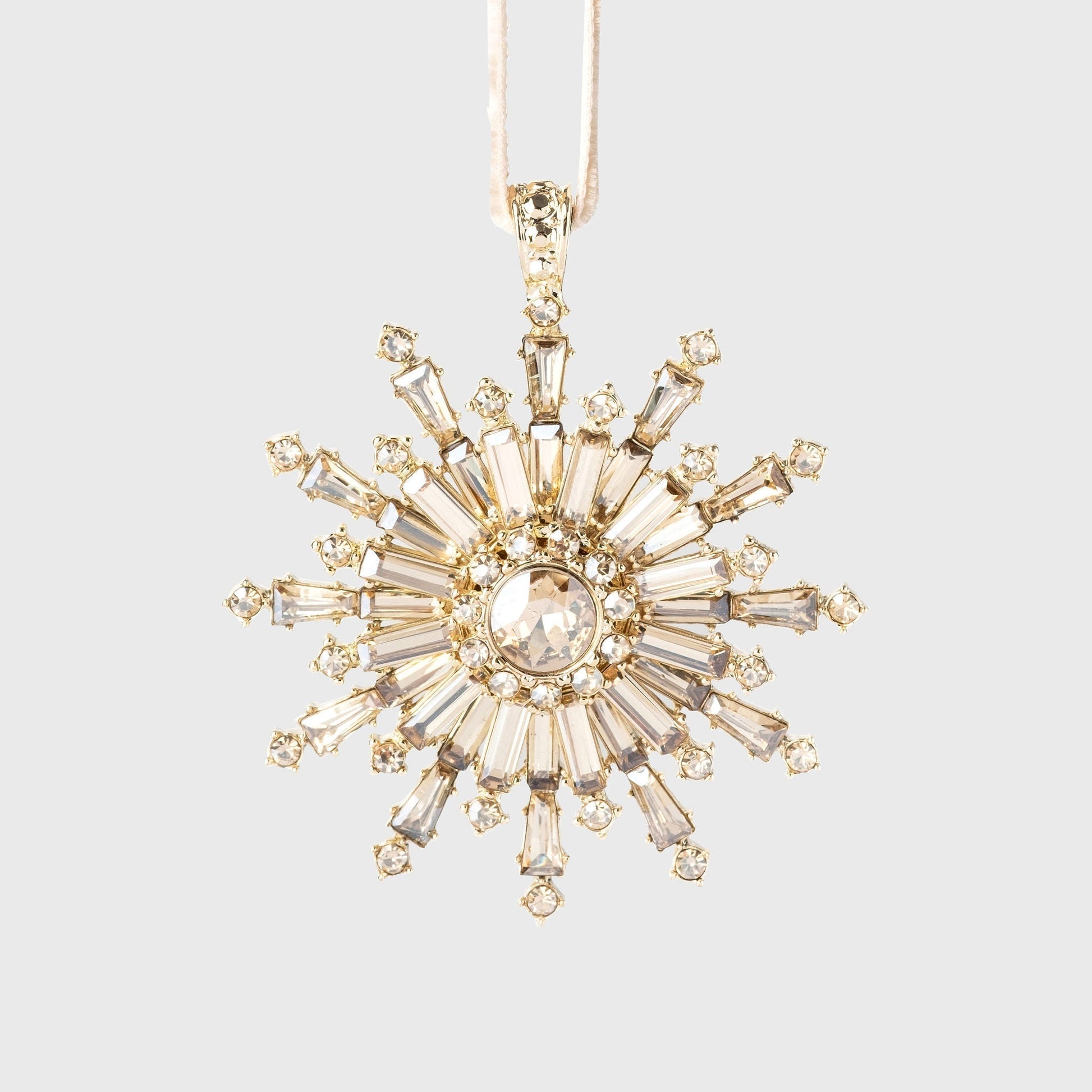 This shimmering gold snowflake ornament will certainly signal the celebrations to come! We used a pale gold glass stone on this ornament, so it's a super delicate color and stunning when used in multiples. Let it snow!