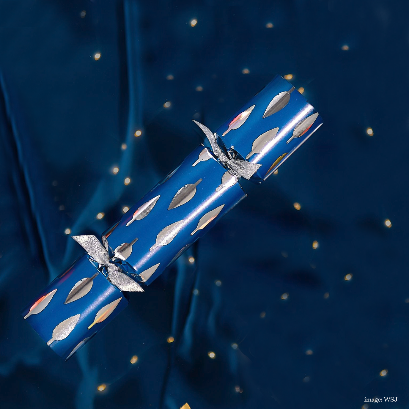 These navy luxury celebration crackers are our glam take on a British classic. Silver crowns, jeweled cocktail straw favors and word games make every place setting feel like a party.