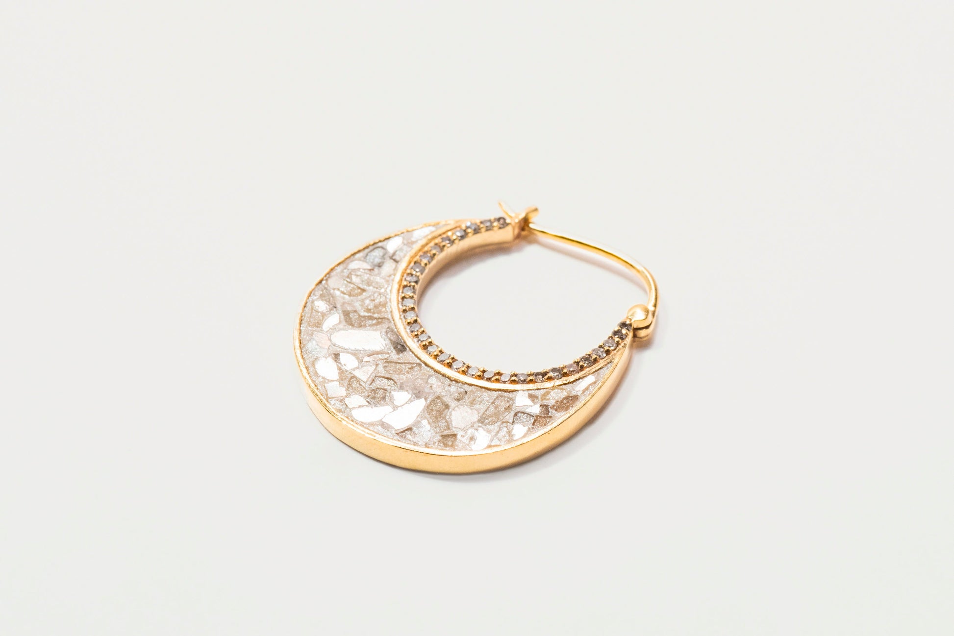 Understated yet luminous—the Nin Gold Vermeil Hoop Earrings evoke moonlight in motion. Sliced raw uncut diamonds and pavé champagne stones shimmer softly against white resin, framed in 18k gold vermeil. Designed to capture light, confidence, and love—all at once.
