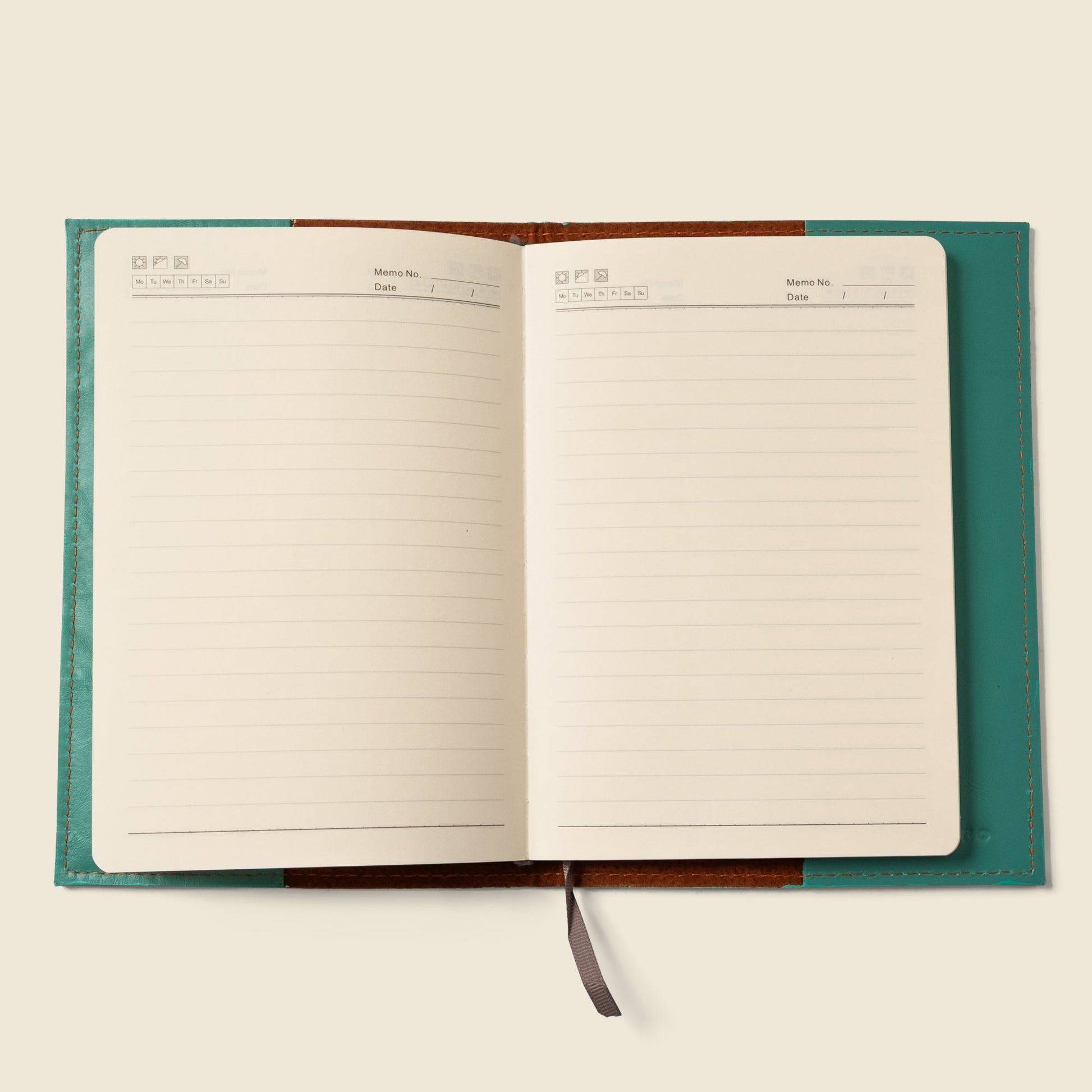 • In the box: 1 teal refillable A5 leather notebook cover and 1 ruled A5 notebook.