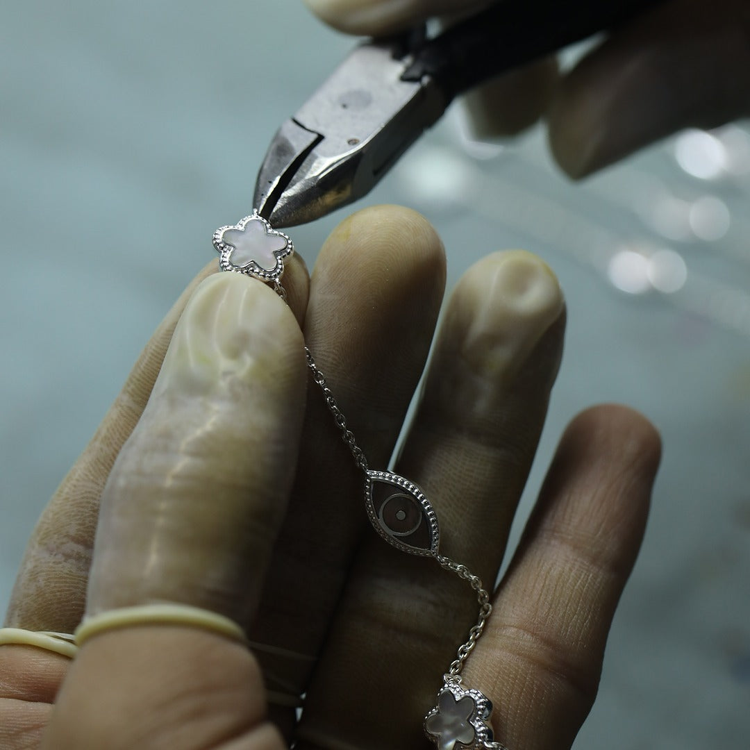 Multi-symbol charms (10–12 mm) in white and grey mother-of-pearl with 18K gold-plated silver & brass.
